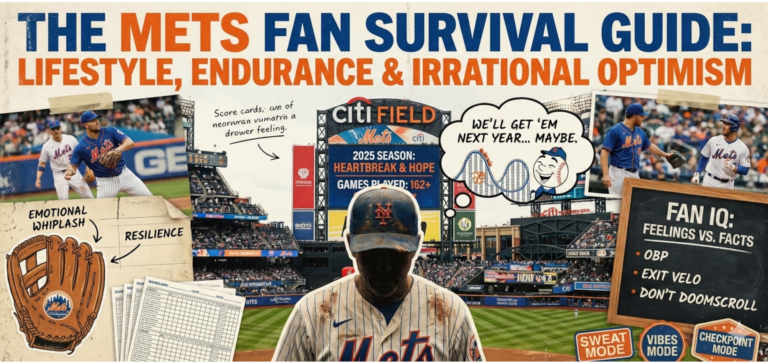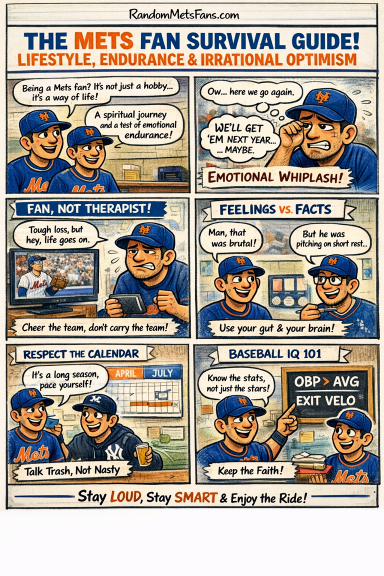 Being a Mets fan is not just a hobby, it’s a way of life. As one long-suffering fan put it, “being a Mets fan isn’t just a hobby. It’s a lifestyle, a spiritual journey, a personality trait, and a slow-burn emotional endurance test that builds character”. Expect side effects like irrational optimism, emotional whiplash, and familiarity with the phrase “we’ll get ’em next year” (spoiler: next year never comes). The good news is you can be a kick-ass Mets fan without losing your mind, without turning every loss into a personal crisis, and without spending your life arguing on Twitter. This evergreen playbook covers the mindset, knowledge, habits, and humor that will keep you loud, proud, and (mostly) sane, even when the baseball gods are roasting you for sport.