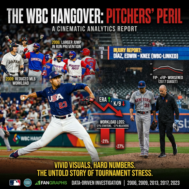 Treat “pitched meaningful WBC innings” as a probabilistic workload and volatility flag, not an automatic fade: the best-supported historical signal is reduced MLB innings and occasionally worse early-season effectiveness for certain profiles, especially starters with heavy prior workloads or fragile injury histories.  For fantasy, the edge is in pricing the risk correctly: discount a little in volume projections, watch April velocity and pitch mix like a hawk once Statcast starts flowing, and be ready to pivot quickly if command (BB%) or velo is down. For front offices, the actionable response is less moral panic and more process control: align ramp-up programs, cap tournament pitch counts, plan for April workload management, and pre-define medical “off-ramps” for pitchers who show acute fatigue markers. (This is an inference grounded in the known timing/routine concerns and the observed workload/performance shifts in prior analyses.)