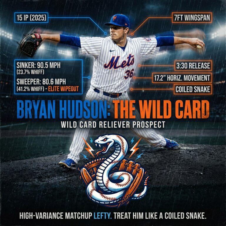 Hudson profiles as a high-variance matchup lefty with one knee-buckler (sweeper) and a heavy sinker. His Stuff+ likely eclipses 110 given his arsenal. Treat him like a coiled snake give him short leashes but high-leverage chances vs. LHB. He’s one to stash high in the bullpen on upside alone.