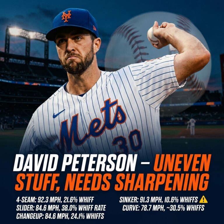 Without maxing fastball movement, Peterson needs precise sequencing and location to succeed. His slider and curve win by pitch design, when commanding them well, big whiffs follow. If not, he gives up contact and runs. He’s at a fork: either dial up vertical on fastballs or lose his roster spot.