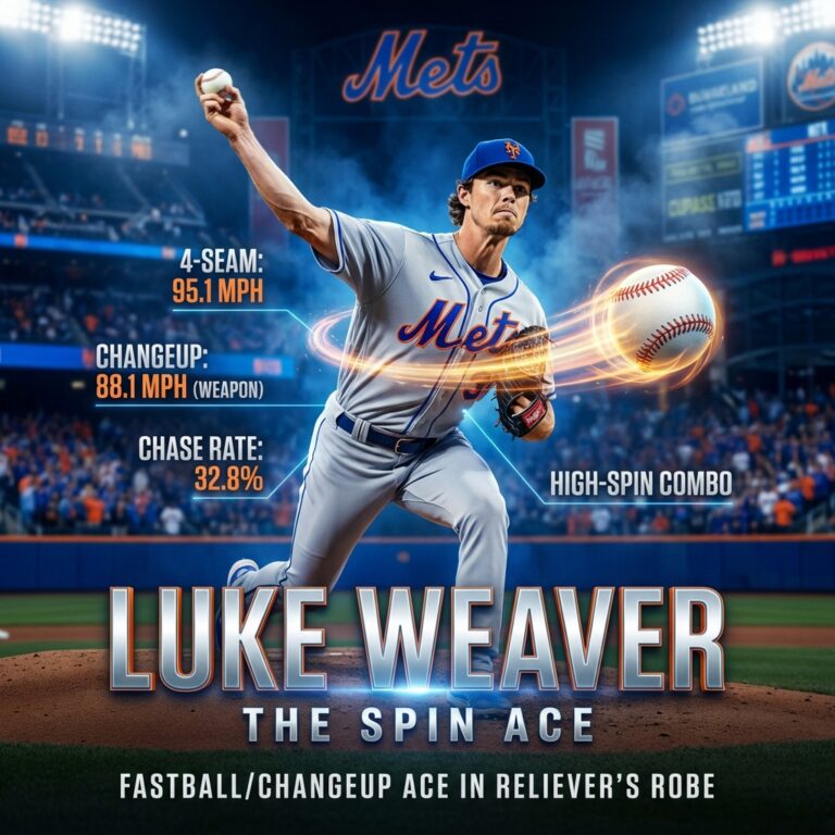 Weaver thrives on deception and mix, living between hands with FB vs change. League-average K% for LHP is ~24% he’s clearly above. If he adds another breaking ball or slight angle adjustment, he could lengthen outings. For now, he’s a high-spin super-sub with playoff pedigree.