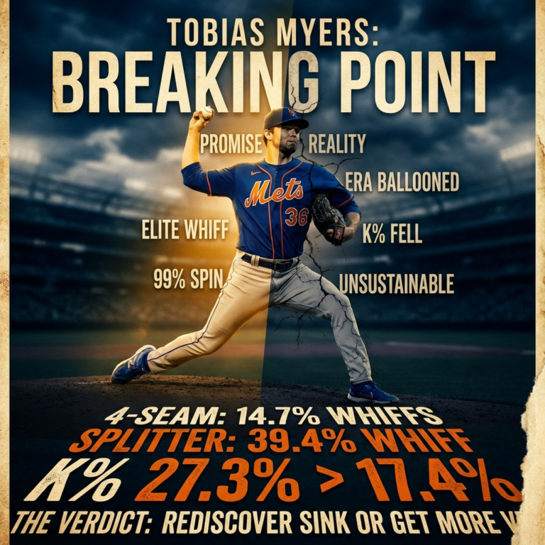 Myers needs to rediscover sink or get more vertical movement. With his size and stuff, he should induce more grounders. His superb spin efficiency (splitter ~91%, cutter ~71% active) shows the weapons are there, but 2025 data screams for adjustment. Think of him like a live bullet, useful in short bursts but hittable if overexposed.