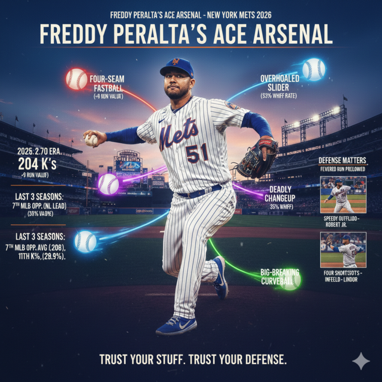 All the defensive upgrades aside, Freddy Peralta’s own evolution is a huge part of the equation. In 2025 with Milwaukee, he threw a career-high 176⅔ innings and posted a career-best 2.70 ERA, establishing himself as a bona fide ace. Over the past three seasons, Peralta has been roughly a top-20 pitcher in MLB by most measures, ranking 7th in opponent batting average (.208) and 11th in strikeout rate (28.9%) among starters in that span. His strikeout-minus-walk percentage (K–BB%) sat around 20%, which is elite territory, and he’s consistently difficult to square up. In fact, last year he ranked near the top of the league in limiting hard contact (among the leaders in lowest hard-hit rate and exit velocity) while still piling up whiffs. This is a pitcher with the stuff to dominate on his own – but now, with a stronger defense, he can pitch even more freely.