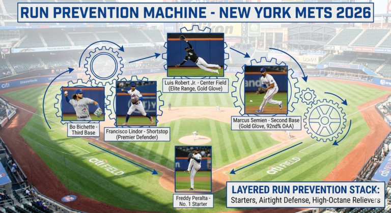 To correct course, the Mets imported a wave of players with strong gloves and athletic profiles. Semien, acquired in the Nimmo deal, just won a Gold Glove at second base and ranked in the 92nd percentile for OAA at that position, immediately shoring up a long-time weakness at the keystone. In center field, New York traded for Luis Robert Jr., an elite defender with 93rd-percentile outfield range (and a past Gold Glove on his shelf). He replaces Nimmo in center, turning what was a mildly below-average spot into a likely strength. If anything, the Mets now have an embarrassment of riches in outfield defense, Tyrone Taylor, another plus glove acquired as a depth piece, could end up in left field, providing an upgrade there as well. Meanwhile, the left side of the infield gets the aforementioned Bichette (a rangy 25-year-old shortstop moving to third) alongside Lindor (still one of the game’s premier defensive shortstops when he’s right). On paper, that’s potential defensive upgrades at four or five positions compared to last Opening Day. It’s no wonder Stearns invoked his Milwaukee roots: the blueprint looks like something the Brewers would design, run prevention at all costs. The logic is simple: fewer holes in the field + deeper pitching = fewer runs allowed.