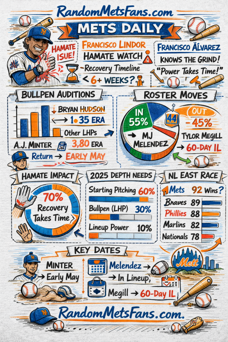 - Francisco Lindor’s hamate watch just hijacked camp. This is one of those “it’s fine until it isn’t” injuries, because grip strength and bat speed don’t lie. The good news is the calendar is still on the Mets’ side. The bad news is hamates love stealing power for a while, even after a guy is “back.”