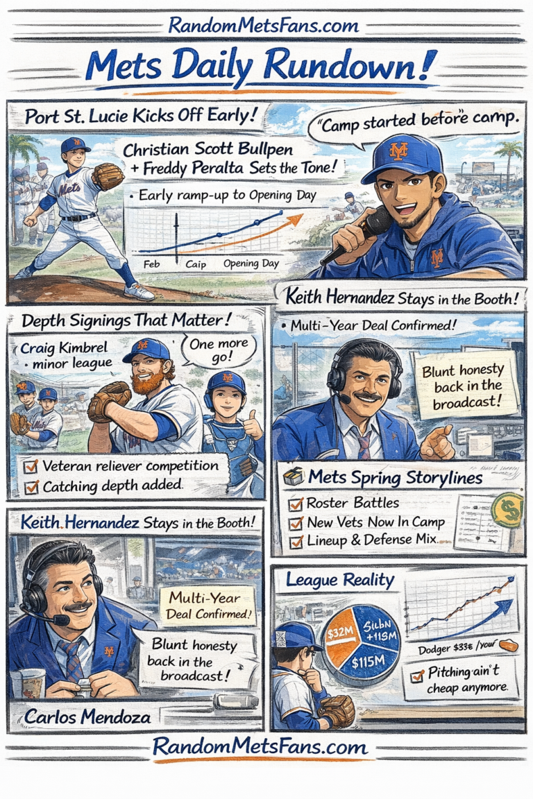 - Depth signings that matter in February. The Mets brought in Craig Kimbrel and Austin Barnes on minor-league deals with big-league spring invites. Translation: veteran bullpen lottery ticket plus catching depth, no drama required.