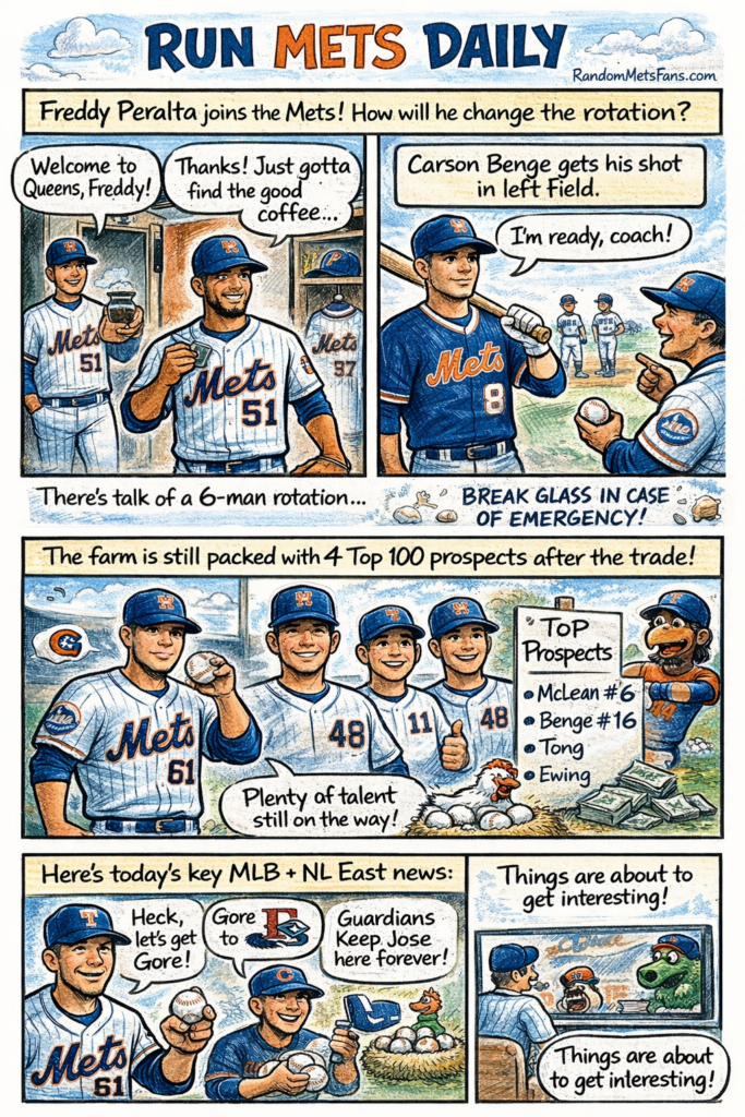 • Freddy Peralta extension talk is officially “not today.” Stearns is slow-playing it, letting Peralta settle in before any contract chatter gets real. Translation: the Mets want him long-term, they just don’t want to negotiate on Day 1 with a guy still figuring out where the good coffee is.
