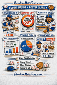 The biggest Mets takeaway today is simple: the kids are kicking the damn door in. Carson Benge made the Opening Day roster and will start in right field, while Craig Kimbrel did not make the club and Sean Manaea is opening the year in the bullpen. That tells you exactly where this team is right now, upside first, nostalgia second.