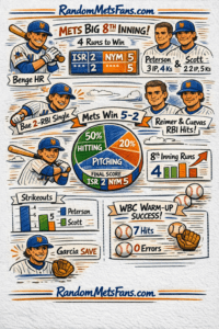 - The Mets walked off the “WBC warm-up” portion of camp 2–0, coming from behind to beat Team Israel 5–2 on Wednesday in Port St. Lucie.