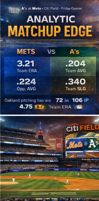 The clean version is this: if the Mets handle counts, keep the A’s power bats from ambushing them, and let their current core do what its metrics say it can do, this is a series they should win. Not maybe. Should. Citi Field, current roster, better top-end offensive indicators, and a favorable opening starter profile all point in the same direction. Now they just have to go do it, which for this franchise has occasionally been the part where the furniture catches fire.