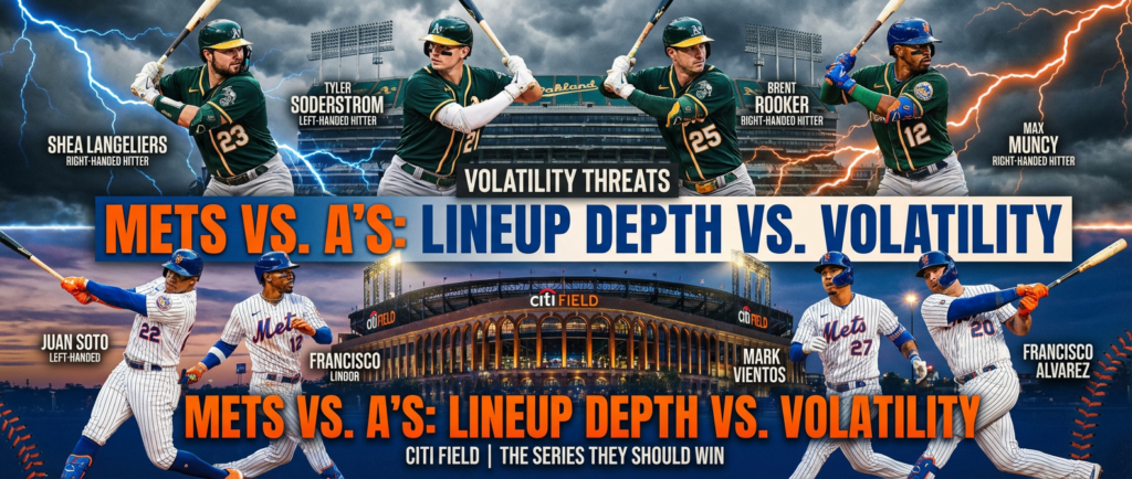 This is not just Mets vs. A’s. It is lineup depth vs. volatility. The Mets now have a more modern offensive shape with multiple right-handed and left-handed threats spread through the order, while Oakland still leans heavily on a few bats to do the heavy lifting. If the Mets pitch clean innings and avoid feeding Langeliers, Rooker, or Muncy in damage counts, the series should tilt toward New York pretty naturally.