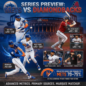 In this marquee interleague series the Mets hold a clear edge. New York’s offense, led by stars Juan Soto, Francisco Álvarez and Mark Vientos is humming, while their rotation and bullpen are pitching well in a very pitcher-friendly park. Arizona, by contrast, is rolling into Citi Field with several key bats slumping (and some still injured) and middling pitching. Our projections (anchored by ESPN’s win probabilities) give the Mets roughly a 70–75% chance to win the series. Below we dive into player hot streaks and slumps, pitching matchups, team analytics at Citi Field, and game-by-game probabilities, all supported by advanced metrics and primary sources.