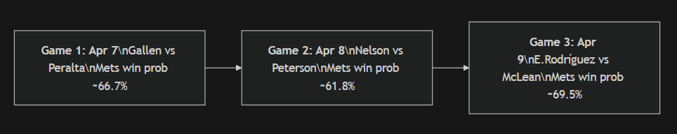 Using a simple model weighted by starting pitching and 30-day form, the Mets are heavy favorites. ESPN’s in-game predictors give the Mets win probabilities of ~66.7% (Game 1), ~61.8% (Game 2) and ~69.5% (Game 3). This implies New York wins ~2.1 games on average and ~73% chance to take the 3-game series .