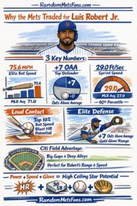 At the end of the day, the Mets’ acquisition of Luis Robert Jr. is all about upside, specifically, the upside of a player who can impact the game with his bat, his glove, and his legs. Few players possess that triad of elite tools, especially in center field. “If you’re looking for a Gold Glove defender who can hit 40 homers at the hardest outfield spot and swipe 30 bags, he’s one of maybe three players in the entire majors who fits the bill,” one analysis noted of Robert. That is the kind of ceiling we’re talking about, essentially an MVP-caliber profile. The Mets paid a hefty price in prospects and are willing to pay Robert’s hefty salary, not because they expect him to instantly replicate his 2023 All-Star numbers, but because they believe his ceiling is worth chasing and his defense provides a solid floor in the meantime. As a Mets beat writer observed, “The floor is useful, his ceiling is transformative”. In the worst case, even if Robert’s bat only rebounds partway, the Mets will still have a high-quality defensive center fielder (a position where they had a void) who contributes on the bases and hits the occasional thunderous homer. In the best case, they have a superstar. That range of outcomes and the tantalizing possibility of the latter, made this a risk worth taking.