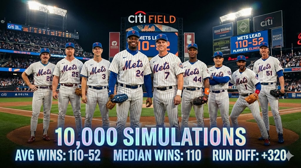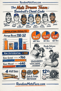 So I built the ultimate “I wish they were Mets” roster from my favorite guys growing up, then I ran 10,000 simulated seasons in a modern scoring environment using 3-year peak versions of each player. DH is on, since MLB decided pitchers hitting was “bad for offense” and not “the funniest thing in sports.”